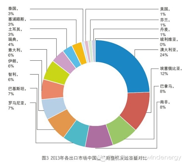 2013年,中國同樣有7家風電機組制造商向國外出口風電機組,當年新增發(fā)運的341臺,容量692.35MW。截至2013年年底,中國風電機組制造商已累計出口的風電機組共計747臺,總?cè)萘窟_到1392.5MW。2013年出口的設備容量和整機數(shù)量仍超過了往年總和。2013年風電機組出口的國家為16個,其中澳大利亞是當年風電機組出口量最高的國家,占比24%;其次為埃塞俄比亞,占比12%。