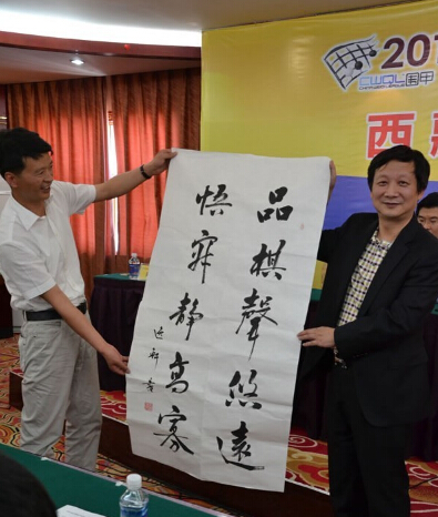 發(fā)布會(huì)最后曹大元九段代表兩隊(duì)棋手像王斌贈(zèng)送國手簽名的棋盤,王斌則用三幅字回贈(zèng)兩隊(duì)。