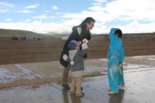 2007年8月援教期滿后,白覺措回到拉薩,在當雄縣納木湖鄉(xiāng)中心小學任教。四千八百米的納木湖鄉(xiāng)中心小學是拉薩市海拔最高的學校。每到冬天,這里都會迎來大風雪。而在大雪封山時,蔬菜是運不進來的。所以,白覺措和其他老師還要利用休息的時間帶領學生們在學校的高寒溫棚內自己種菜,以備不時之需。白覺措淡淡得說道:“這里的夏天是很美,冬天卻讓人受不了。而且夏天并不是天天都是風和日麗,時不時還會來場冰暴。”正說話間,豆大的冰雹就下起來,“噼哩叭啦”打在窗戶上。白覺措急忙起身向外走去,因為正值午飯時間,學生們正朝食堂走向。天冷地滑,怕學生摔倒白覺措拉著自己兩歲半的兒子,站在空地上,對著遠處跑來的學生不停地喊道:“慢點,慢點,小心摔倒!……”。