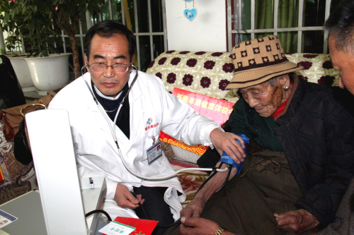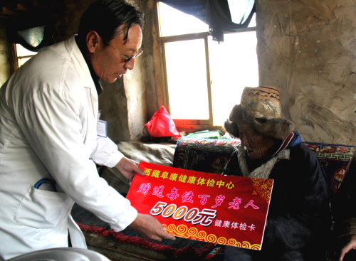 西藏高寒缺氧,自然環(huán)境惡劣,60多年前,這里的人均壽命才35.5歲。然而60多年后,2012年拉薩市所有七縣一區(qū)百歲老人就有16位,這些走過兩個世紀(jì)的百歲老人,見證了西藏翻天覆地的滄桑巨變,他們是全社會的寶貴財富,更是西藏從貧窮走向繁榮富強(qiáng)的親歷者、見證者。在全國人民喜迎黨的十八大勝利召開之際,西藏阜康(國際)體檢中心與拉薩市民政局老齡辦組織發(fā)起了“關(guān)愛百歲老人行動”。我們歷時16天,里程2000多公里,尋訪了拉薩七縣一區(qū)十一位百歲老人,我們不僅為每位老人送上了精心準(zhǔn)備的三千元現(xiàn)金、五千元健康體檢卡、一個便攜式氧氣瓶、一個便攜式血壓儀,還為他們送上了免費義診和相關(guān)藥品。王斌董事長參加了此項活動的啟動儀式,嘎布院長、張德才院長親自帶隊為每一位百歲老人做了常規(guī)的身體檢查,并送上了藥品和祝福。