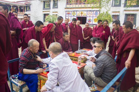 義診現(xiàn)場(chǎng),醫(yī)療隊(duì)熱情接待每一位前來(lái)就診或咨詢的僧侶,為其看病、發(fā)放藥品及講解日常健康知識(shí)和自我保健的方法,僧侶們也由一開(kāi)始的只是駐足觀望轉(zhuǎn)為積極上前就診,并主動(dòng)向醫(yī)療隊(duì)闡述自己的病狀,同時(shí)針灸科李泉濤醫(yī)生更是不間斷地為多位經(jīng)常久坐寺中的僧侶推拿與按摩頸、肩、腰、腿等各個(gè)部位。中午時(shí)分,醫(yī)療隊(duì)還受邀與僧侶們一起吃齋飯。