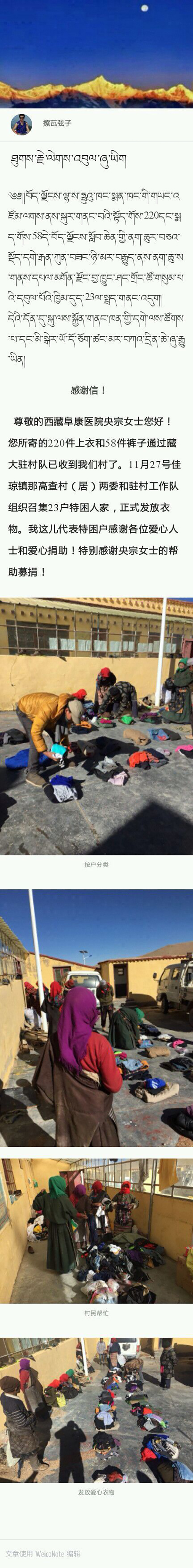 感謝信是寫給央宗女士以及她所募集到的各位愛心人士的,因為那高查村收到的220件上衣和85件褲子,正是央宗花費兩個多月時間,通過號召身邊親朋好友的方式所籌集到的,當(dāng)然其中也有央宗自己送出的一些衣物。這些干凈的舊衣物,對于很多人來說,當(dāng)然算不得什么,但對于那高查村的23戶特困人家來說,這可是非常值得高興的事情了,因為他們至少不必再那么擔(dān)心寒冬的到來。