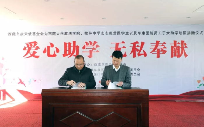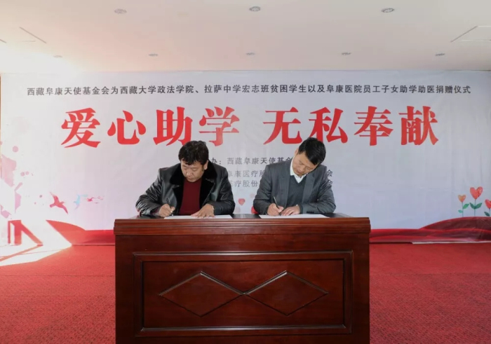 西藏阜康天使基金會(huì)理事長(zhǎng)、西藏阜康醫(yī)療股份有限公司黨委書(shū)記、董事長(zhǎng)王斌與拉薩中學(xué)校長(zhǎng)陳飛簽訂捐助協(xié)議