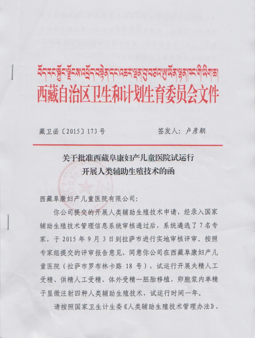 關(guān)于批準(zhǔn)西藏阜康婦產(chǎn)兒童醫(yī)院試運(yùn)營開展人類輔助生殖技術(shù)的函