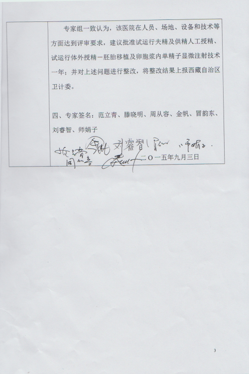 你公司提交的開展人類輔助生殖技術(shù)申請(qǐng),經(jīng)錄入國家輔助生殖技術(shù)管理信息審核通過后,系統(tǒng)遴選了7名專家,于2015年9月3日到拉薩市進(jìn)行實(shí)地審核評(píng)審。按照專家組提交的評(píng)審報(bào)告意見,同意你公司在西藏阜康婦產(chǎn)兒童醫(yī)院(拉薩市羅布林卡路18號(hào)),試運(yùn)行開展精子人工受精、供精人工受精、體外受精-胚胎移植、卵胞漿內(nèi)單精子顯微注射四種人類輔助生殖技術(shù),試運(yùn)行時(shí)間一年。