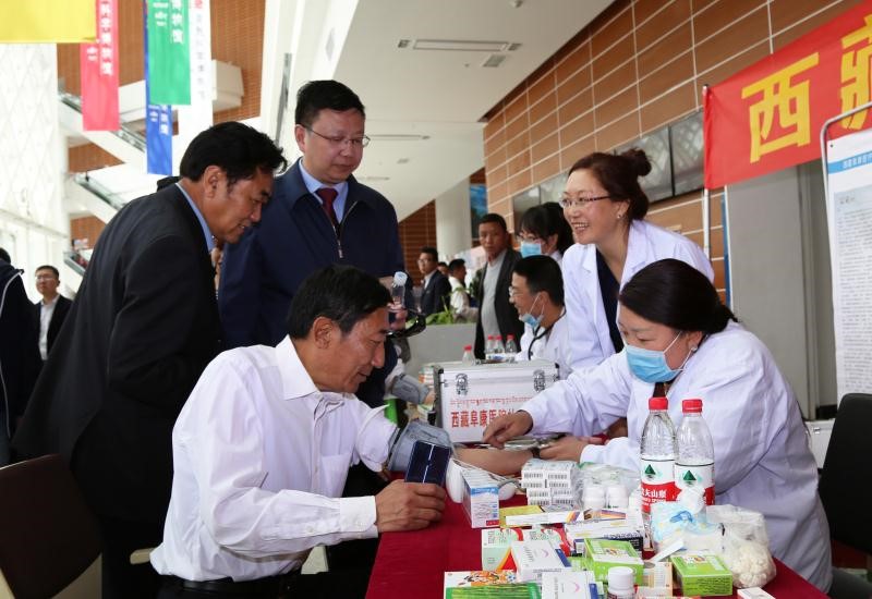 西藏自治區(qū)科技廳廳長(zhǎng)赤列旺杰在我院展位測(cè)量血壓