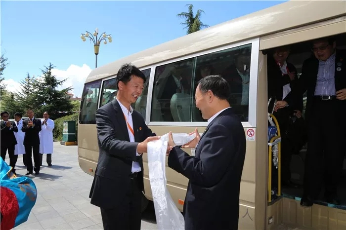 西藏阜康醫(yī)療股份有限公司黨委書記、董事長王斌同志為蒞臨阜康醫(yī)院考察指導的領導獻上哈達