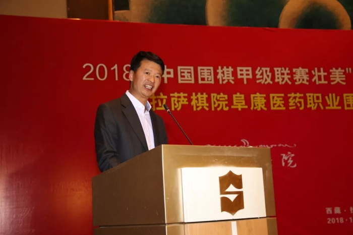 西藏自治區(qū)政府副主席甲熱·洛桑旦增代表自治區(qū)人民政府對各位嘉賓的到來表示熱烈歡迎。他說圍棋是一切棋類運動的鼻祖,是中華民族優(yōu)秀傳統(tǒng)文化的瑰寶,融合了軍事、哲學(xué)、詩詞等多種文藝形式,是中華民族幾千年來智慧的結(jié)晶,也是對人類文明的重要貢獻。在建設(shè)社會主義文化強國、體育強國、實現(xiàn)中華民族偉大復(fù)興的中國夢進程中,圍棋這樣一項由文化融進體育的智慧運動承擔(dān)著重要的歷史使命。拉薩棋院西藏阜康醫(yī)藥職業(yè)圍棋隊沖甲成功是西藏體育發(fā)展的重大突破,也是社會力量推動體育事業(yè)發(fā)展的典范。為此我代表自治區(qū)人民政府對西藏阜康醫(yī)藥職業(yè)圍棋隊沖甲成功表示熱烈祝賀,對社會各界支持西藏體育事業(yè)發(fā)展表示感謝,自治區(qū)政府將加快推進體育事業(yè)改革、做強做大體育產(chǎn)業(yè),促進全區(qū)體育事業(yè)再上臺階。祝愿2018年中國圍棋甲級聯(lián)賽壯美“第三極”西藏專場取得成功,祝愿西藏阜康醫(yī)藥職業(yè)圍棋隊在明年的甲級聯(lián)賽中取得更好成績。