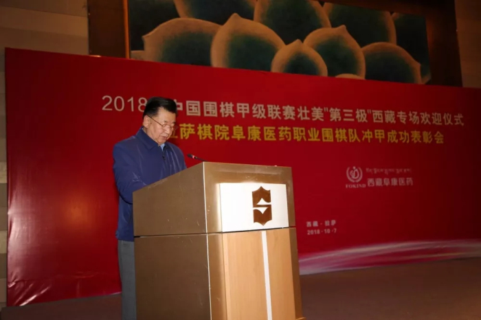中國圍棋協(xié)會主席林建超將軍在致辭中表示,拉薩棋院西藏阜康醫(yī)藥職業(yè)圍棋隊沖甲成功是全國圍棋運動中的一件大事。它首先改變了當(dāng)代中國圍棋運動的版圖,雪域高原第一次在中國圍棋甲級聯(lián)賽中占有了一席之地;其次,這次沖甲實現(xiàn)了西藏體育發(fā)展的一次突破,使西藏在全國性的體育賽事中,擁有了第一支甲級職業(yè)隊伍;第三,本次沖甲成功,為圍棋文化和藏式棋類文化的交融促進提供了一個很好的契機,為西藏地區(qū)棋文化的發(fā)展起到了很好的推動作用。這項成績來之不易,首先應(yīng)該歸功于自治區(qū)各級黨委、政府的重視,尤其是齊扎拉主席長期以來對包括圍棋、藏式棋等棋類活動的支持,有效促進了這項中華民族優(yōu)秀傳統(tǒng)文化在雪域高原的普及與發(fā)展,這是與習(xí)近平總書記在十九大報告中提出的戰(zhàn)略目標(biāo)相一致的。