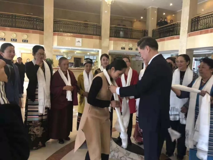西藏自治區(qū)黨委常委、組織部部長曾萬明為西藏阜康醫(yī)藥發(fā)展有限公司總經(jīng)理劉瀟瀟女士獻上潔白的哈達