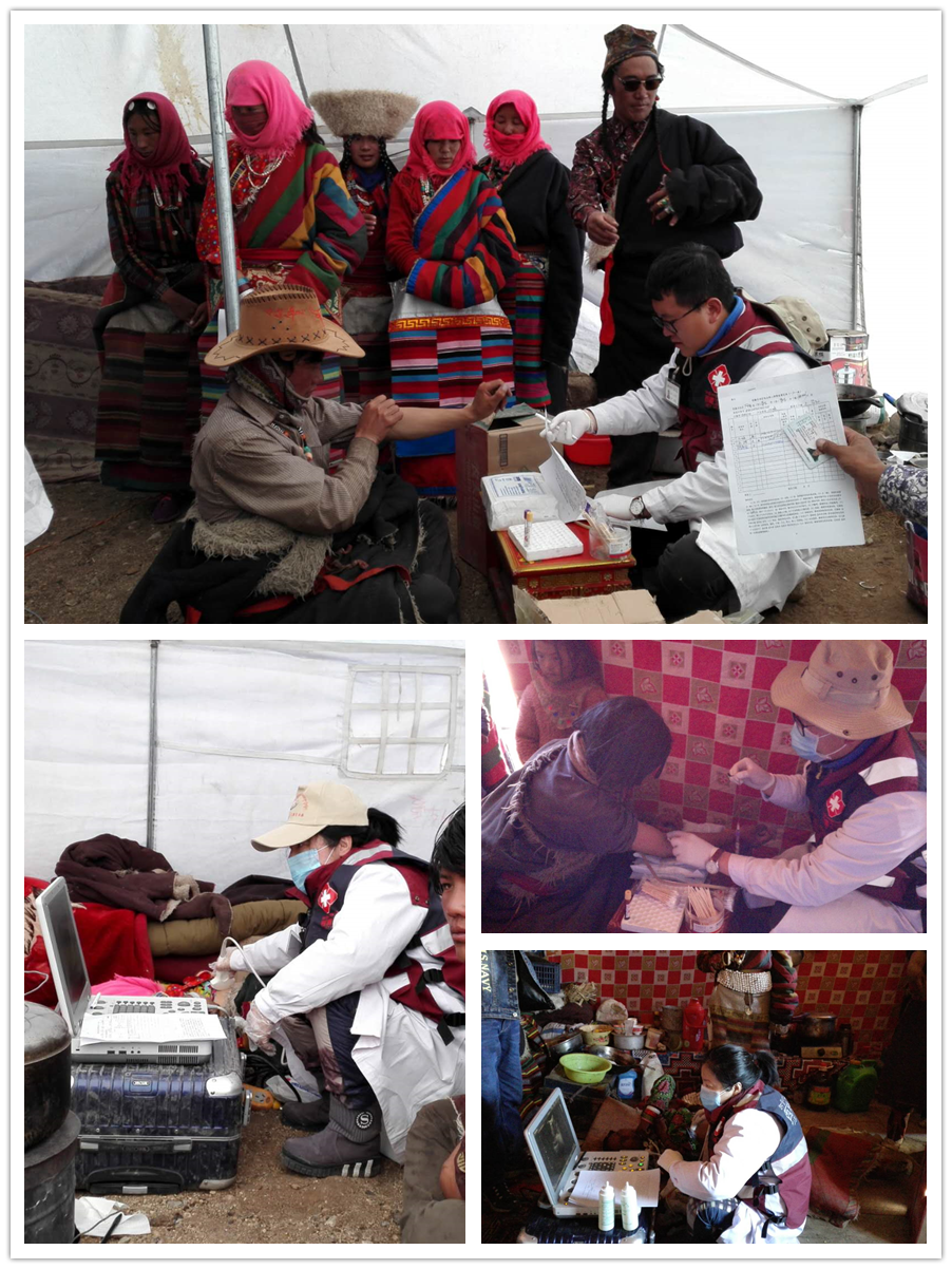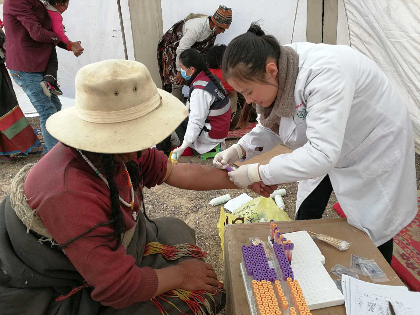 格桑拉吉技師與劉亞美護(hù)士隨同當(dāng)?shù)匦l(wèi)生院拉瓊老師前往文布鄉(xiāng)夏瑪村牧區(qū)深處,由于前往的路途顛簸、含氧量稀薄,醫(yī)療隊的隊員都出現(xiàn)不同程度的頭暈惡心,但他們見到焦急等待的牧民后,不顧舟車勞頓,克服身體的不適,迅速進(jìn)入臨時搭建的帳篷開始為牧民篩查。篩查結(jié)束后,當(dāng)隊員們要離開時,夏瑪村村長及村民站在車旁為我們送行,嘴里還不停地說著:門巴 突及其,扎西德勒!”(藏話:謝謝大夫!吉祥如意!)