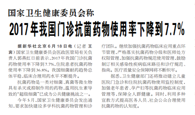 據(jù)新華社北京6月18日電 (記者 王賓) 國家衛(wèi)生健康委員會醫(yī)政醫(yī)管局有關負責人郭燕紅日前表示,2017年我國門診抗菌藥物使用率下降到7.7%,住院患者抗菌藥物使用率下降到36.8%。我國細菌耐藥趨勢總體平穩(wěn),臨床合理用藥水平不斷提升。