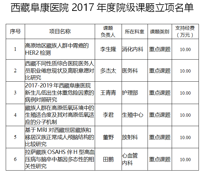 這是我院首次組織申報(bào)并批準(zhǔn)立項(xiàng)的院級(jí)課題。課題主持人均為我院醫(yī)務(wù)人員。本年度立項(xiàng)資助的6個(gè)課題均為院級(jí)重點(diǎn)課題,每項(xiàng)課題將提供10萬元的研究經(jīng)費(fèi)。課題自2017年10月1日正式實(shí)施,期限為兩年。