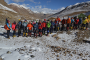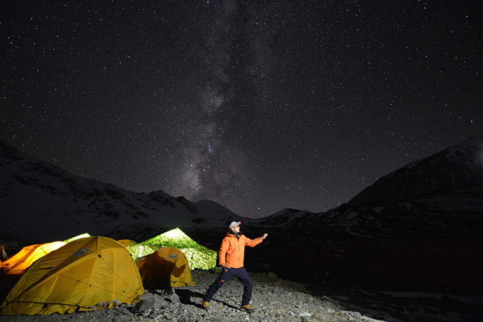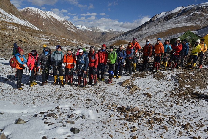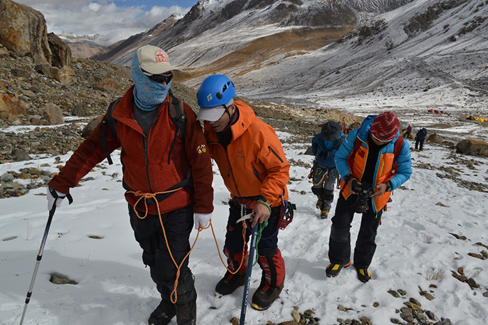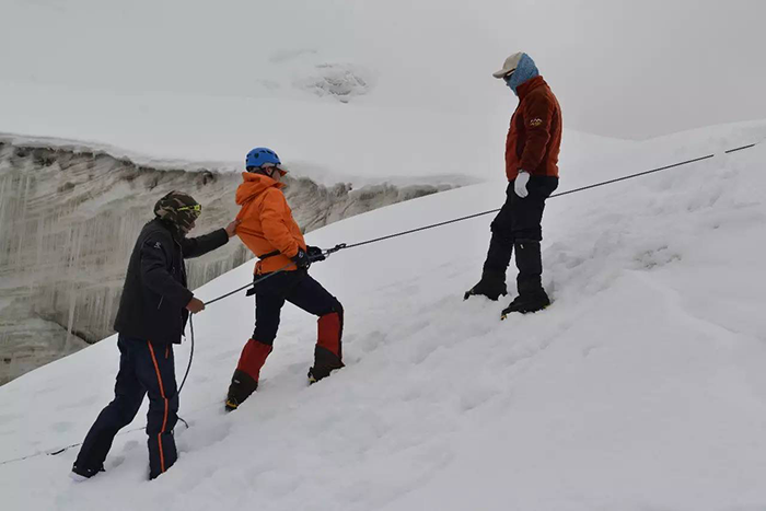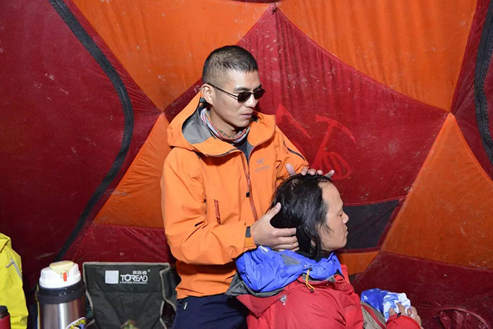 在海拔5500米處的雪線位置,教練們,選擇了一處較為平緩的雪坡,作為大本營,在這里對隊員們進行登頂前的指導訓練。指導隊員們使用上升器與下降器,體驗穿著高山靴帶著冰爪走路的感覺,教練們在這里認真介紹技術要領,并耐心解答隊員們提出的各種問題。休息之余大家都躲在帳篷里,有說有笑,完全消除了屋外雪山的寒冷。有從內(nèi)地來的隊友,因高原反應,頭疼難忍,張洪就幫他們一一按摩推拿,緩解疼痛,大家就像一家人,其樂融融。