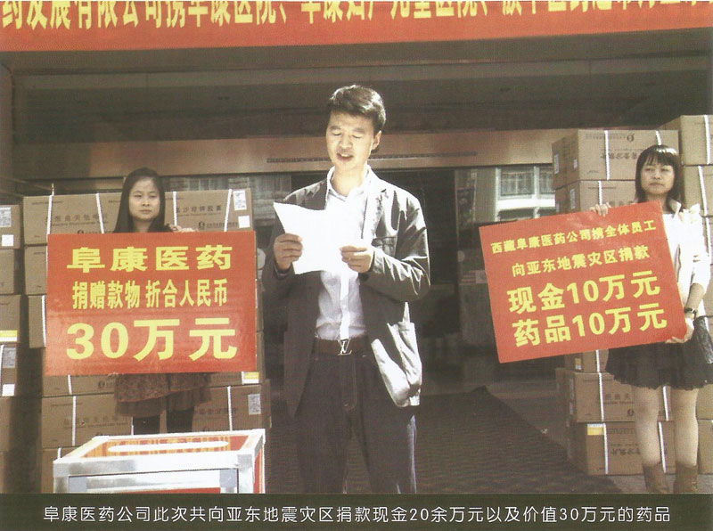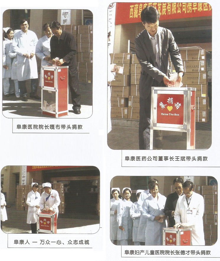 2011年9月8日,印度錫金發(fā)生了6.8級地震,地震造成了亞東縣供水、供電、交通、通信等度全部癱瘓。災情牽動所有西藏人民的心,更牽動著阜康人的心。25日,為了支援災區(qū),阜康醫(yī)藥發(fā)展有限公司攜阜康醫(yī)院、阜康婦產兒童醫(yī)院以及旗下醫(yī)藥超市舉行了為亞東地震災區(qū)捐款儀式。在捐款現(xiàn)場,一箱箱捐助藥品整齊地堆放在起,捐歉員工排著整齊的隊伍有序的走到捐款箱邊,把自己的捐款投入到箱中。