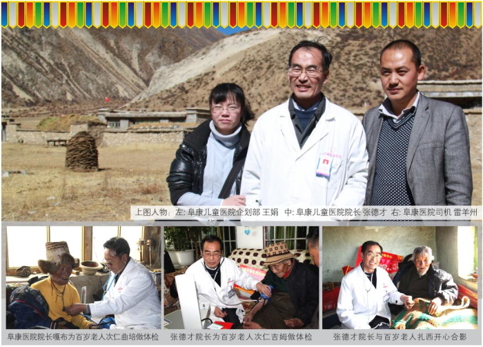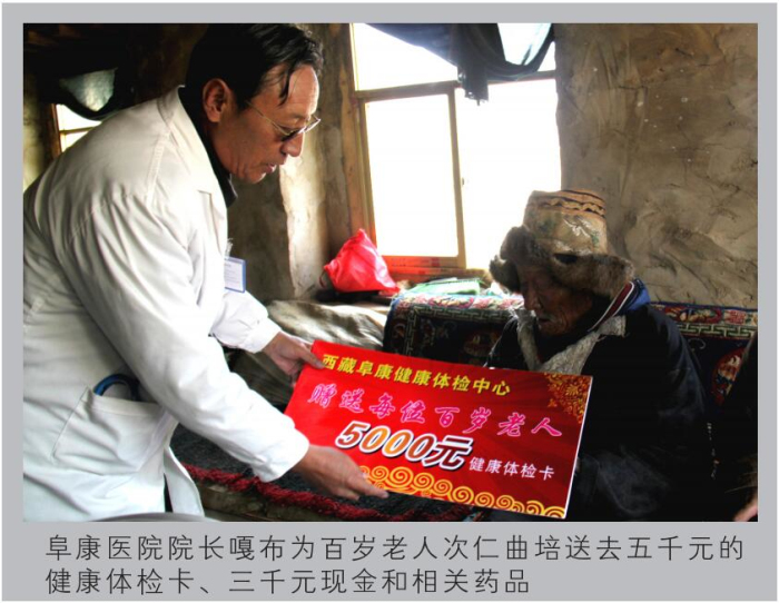 西藏高寒缺氧,自然環(huán)境惡劣。60多年前,這里的人均壽命才35.5歲。然而到了2012年,光拉薩的七縣一區(qū)就有16位百歲老人,正是這些百歲老人,見證了西藏翻天覆地的巨變,他們是全社會(huì)的寶貴財(cái)富,更是西藏從貧窮落后走向繁榮富強(qiáng)的親歷者、見證者。在全國(guó)人民喜迎黨的十八大勝利召開之際,西藏阜康(國(guó)際)健康體檢中心與拉薩市民政局老齡辦組織發(fā)起了“關(guān)愛百歲老人行動(dòng)”。此次行動(dòng)歷時(shí)16天,里程2000多公里,尋訪了拉薩七縣一區(qū)十一位百歲老人,不僅為每位老人送上了精心準(zhǔn)備的三千元現(xiàn)金、五千元健康體檢卡、一個(gè)便攜式氧氣瓶、一個(gè)便攜式血壓儀,還為他們送上了免費(fèi)義診和相關(guān)藥品。王斌董事長(zhǎng)參加了此項(xiàng)活動(dòng)的啟動(dòng)儀式,嘎布院長(zhǎng)、張德才院長(zhǎng)親自帶隊(duì)為每一位百歲老人做了常規(guī)的身體檢查,并送上了藥品和祝福。