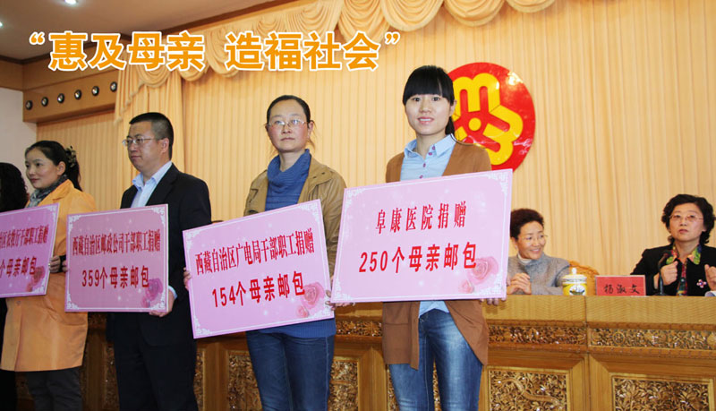 2013年5月1日上年十點,西藏自治區(qū)“母親郵包”公益活動暨捐贈儀式在自治區(qū)常委會議室內(nèi)正式啟動。西藏阜康集團(tuán)懷著高度的社會責(zé)任感心系天下母親,當(dāng)天共捐贈總價值五萬元的郵包250個,并呼吁全體阜康人為天下母親捐贈郵包,奉獻(xiàn)自己的愛心。