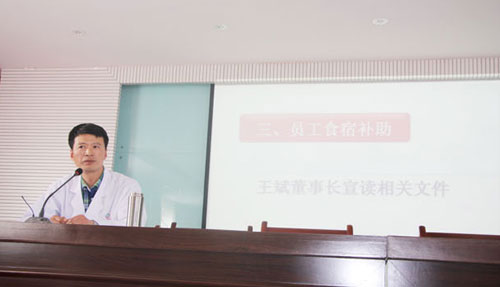 在談到員工食宿補(bǔ)助時(shí),王斌董事長宣讀了相關(guān)文件,并就一些問題做出了解釋:員工的食堂補(bǔ)助由原來的四百元上漲到五百元;從六月份起,由三家醫(yī)院拿出部分收入補(bǔ)貼員工住宿,如此住宿補(bǔ)貼由原來的一百四十元上漲到二百四十元。以此來提高全體員工的食宿質(zhì)量,并以此來保證低收入者不為一日三餐所發(fā)愁,減輕低收入者們的生活壓力。為此,王斌董事長還要求綜合辦公室下發(fā)文件,要求食堂提高飯菜質(zhì)量,保證員工吃上品種多樣且營養(yǎng)又衛(wèi)生的飯菜。對此,張德才院長發(fā)表了自己的一些看法,也談了關(guān)于食堂的一些改革,并對王斌董事長的這項(xiàng)決議表示了大力支持。