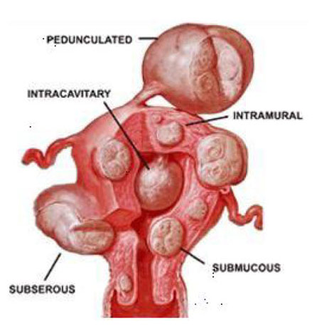 粘膜下肌瘤:子宮增大,宮口擴張,肌瘤位于宮口內(nèi)或脫出在陰道內(nèi)。