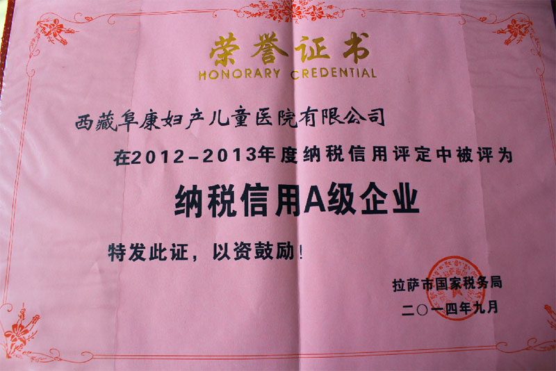 2014年10月17日,拉薩市國稅局召開“拉薩市2012-2013年度納稅信用等級A級納企業(yè)”榮譽(yù)表彰大會。西藏阜康兒童醫(yī)院有限公司被評為“納稅信用A級企業(yè)”。