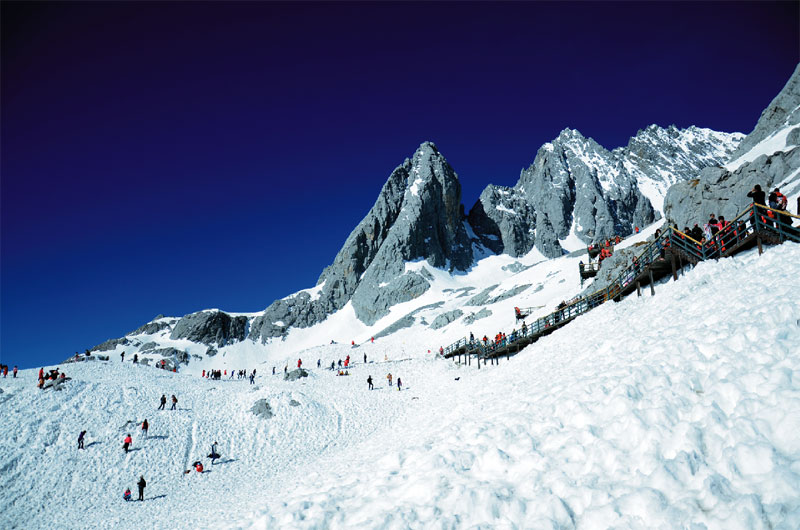 人文的掃興,索性來(lái)場(chǎng)自然之旅。第二天一大早我們就前往了玉龍雪山,還是被告知到達(dá)最高峰的索道票昨日售盡,我們的索道只到得了松杉坪。回憶起來(lái),這也許值得慶幸。松杉坪松樹(shù)高聳如云,木棧道旁有積雪未化,風(fēng)過(guò)樹(shù)梢的積雪隨風(fēng)灑落,偶爾有小松鼠一躍而過(guò),牦牛悠閑自在的吃著草,遠(yuǎn)處是玉龍雪山的最高峰,仿佛近在咫尺。我想所有的生生死死都應(yīng)該在這里戛然而止,所有浮躁的靈魂都應(yīng)該在這里接受洗禮,進(jìn)入輪回,拋卻紅塵暫享這片刻的永生。她是我去過(guò)最接近天堂的地方,