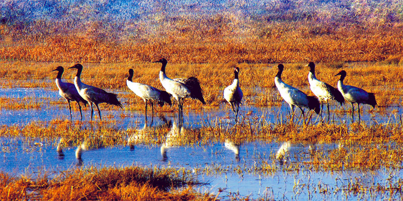 好不容易見到三只,小彭一邊扭著身子一邊低聲自語:“黑頸鶴呀黑頸鶴,你轉(zhuǎn)過身子抬起頭來看看我。又不是孔雀,干嗎總把屁屁朝這邊。”黑頸鶴不懂人語,也懶得猜人的心思。有一點可以保證,這里雖然車來人往,卻是安全的。