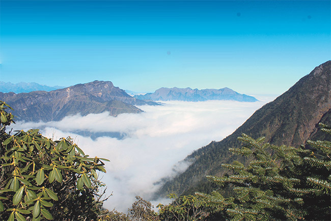 牛背山最令人著迷的便是云海,牛背山的云海,濃密而均勻,壯闊而平緩,隨處可見的瀑布云猶如阿凡達(dá)中“哈利路亞山”一般讓人感覺踏步于空中;而環(huán)顧四周連綿不斷的群山錯(cuò)落有致,層次分明,蜀山之王貢嘎雪山矗立于最高點(diǎn),泥巴山、娘娘山、瓦屋山、峨眉山、夾金山、四姑娘山和二郎山在前,大渡河大峽谷在后,幾乎天府之國的所有名山峻嶺在此時(shí)都變成了玲瓏盆景,而翻滾的云霧之下,群山丘陵逐級(jí)降低,緩緩融入稻浪翻滾的天府平原。