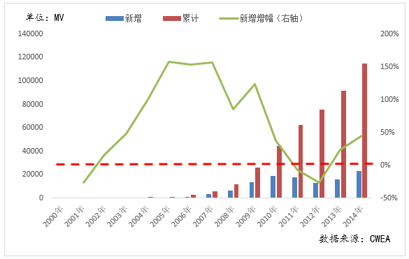 自1990年開始,我國風(fēng)力并網(wǎng)發(fā)電開始起步,在2005年2月《可再生能源法》頒布之后,國內(nèi)風(fēng)電行業(yè)進(jìn)入飛速發(fā)展期,2005-2009年國內(nèi)風(fēng)電行業(yè)每年新增裝機(jī)量幾乎都是超過100%的增長。然而野蠻的發(fā)展之后,隨著2011年初期政策的變動,此前積累的產(chǎn)能過剩問題突然爆發(fā),風(fēng)電行業(yè)驟然間跌入低谷。2011-2012年國內(nèi)風(fēng)電新增裝機(jī)容量甚至出現(xiàn)負(fù)增長;不過伴隨著國家對環(huán)保問題關(guān)注的日益加深,作為清潔能源的風(fēng)電產(chǎn)業(yè)迎來了第二春。