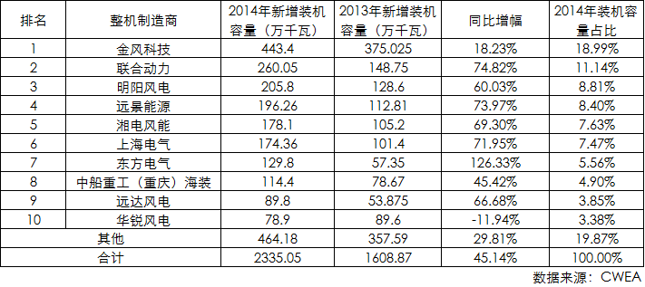表1:2014年國內(nèi)風(fēng)電行業(yè)主要整機(jī)制造商新增裝機(jī)容量情況